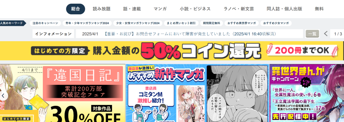 일본의 대형 온라인 서점 중 하나로, 만화뿐 아니라 다양한 장르의 전자책을 판매합니다. 만화 할인 이벤트가 자주 열리며, 대형 출판사의 베스트셀러부터 희귀한 고전까지 폭넓은 라인업을 갖추고 있습니다. 종종 무료 시리즈를 제공해 새로운 작품을 체험해볼 수도 있습니다.
